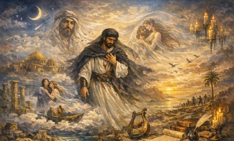 يرجو بخطو الليلِ بعضَ وصالِ ، صافحتُهُ وأخذتُهُ لسحابةٍ تحنو على الترحالِ بالترحالِ ، فسألتُهُ بمقامة الفنِّ البديعِ- وغايةِ العزفِ المريرِ الحالي ، عن عالمٍ كالنهر في ينبوعهِ والصبحِ في ترنيمةِ الإقبالِ